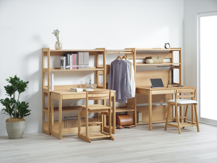 デスクとも組み合わせられる連結式のユニットシェルフ。