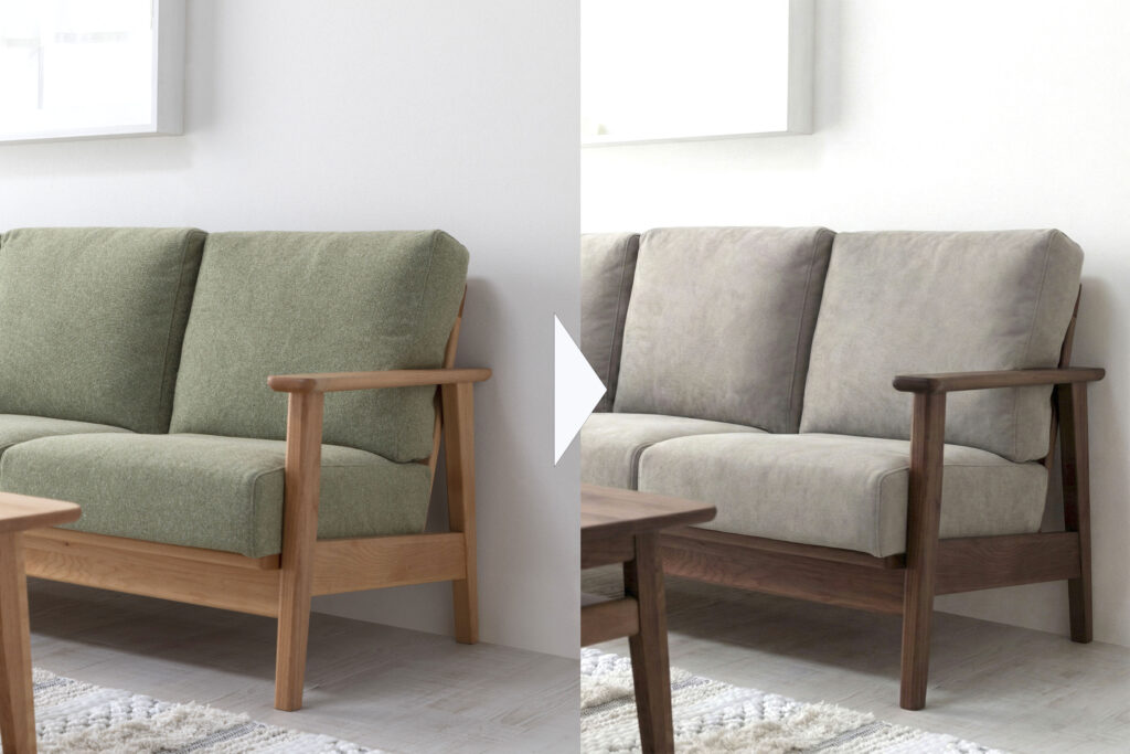 既存の画像をもとに、木部の色変更や張地の張り替えイメージを作成できます 。新商品開発のカラーシミュレーションとしてもご活用いただけます。